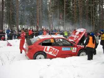 Kuva Ruotsin Rallin viimeiseltä kiirustaipaleelta. Kuka on kuski jonka taival päättyi tähän vähän ennen maalia?